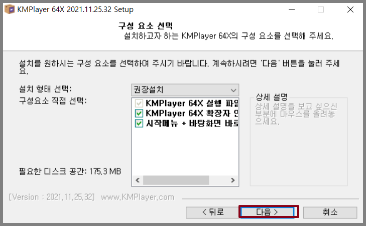 중간에 구성 요소 선택이 있는데, 저의 경우에는 체크해제를 하지 않고 모두 설치를 해주었습니다. 불필요한 게 있으신 분들은 체크 해제를 해주셔도 사용이 가능하신데, 체크해제를 굳이 하지 않으셔도 상관없으실 것으로 보여집니다.